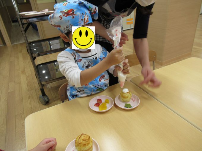 クリスマスなので、今日のおやつは調理の先生の指導の元、食育の一環としてケーキ作りやデコレーションにチャレンジしました。