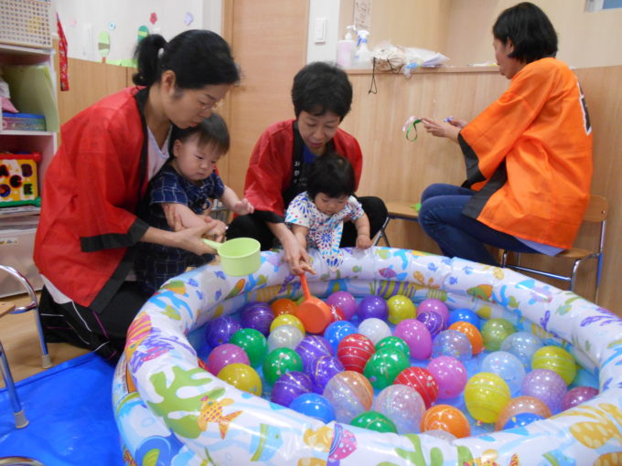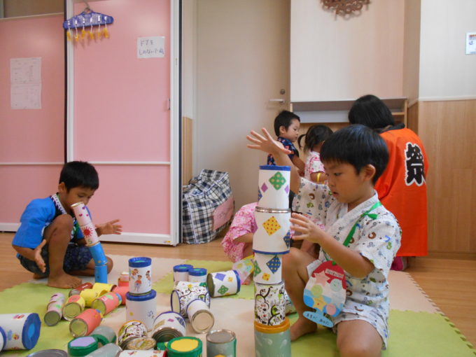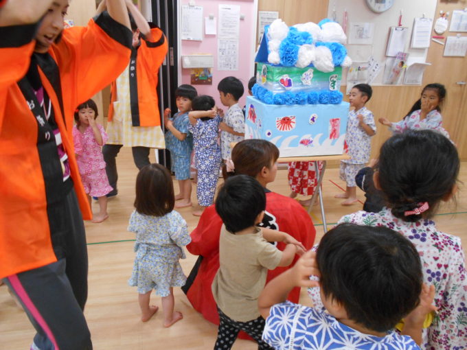 2019年08月01日 季節のイベント 夏まつり いろいろなゲームやお店屋さんごっこ やぐらのまわりで、”きのこ音頭”や”もったいないばあさん音頭”をおどりました。 給食は、バイキング・・・からあげ、焼きそば、えだまめ、ポテトフライ、バナナでした。